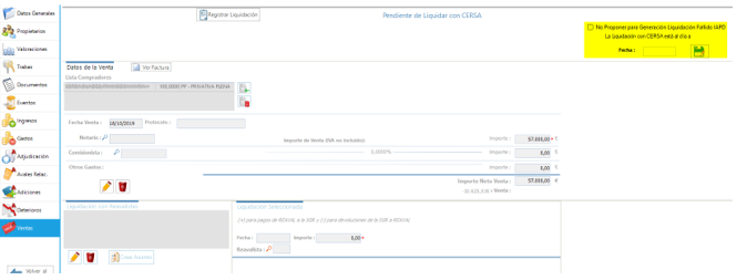 Una vez registrada la venta, pulsando sobre Registrar Liquidación podemos registrar la Liquidación con CERSA o a los distintos Reavales, y se nos habilitará la siguiente zona para indicar los datos: de Fecha e Importe, importes positivos para pagos de Reaval a la SGR y importe negativos para devoluciones de la SGR a Reaval.