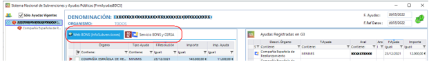 Y en la zona derecha se muestran dos pestañas con las fuentes desde la que proviene la informacion, Web BDNS y Servicio Web BDNS y CERSA, mostrando siempre por defecto la primera de estas.