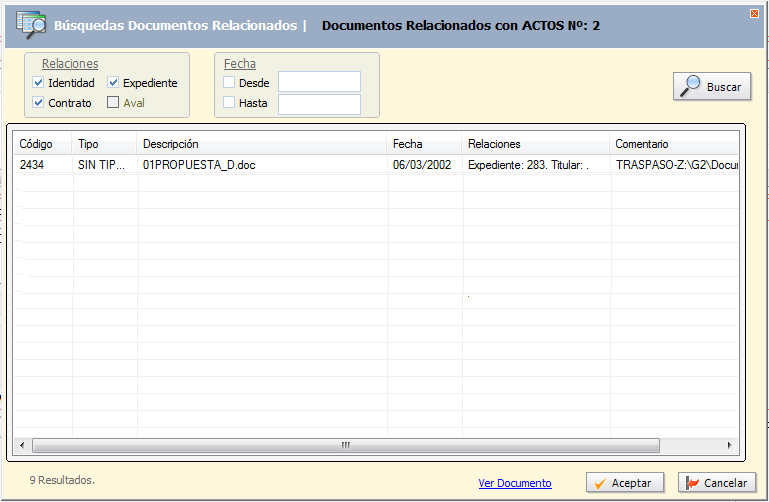 Mediante este Buscador, nos permitirá vincular un documente existente en la zona documental en la zona de Historial o en la zona de Actos Documentados. Al lanzar el buscador nos mostrará los documentos filtrados por la situación en la que nos encontremos (Identidad, Expediente, Contrato o Aval.), posibilita además filtrar por fechas. Mediante la opción "Ver Documento", nos ofrece la posibilidad de visualizar el documento antes de Vincularlo a una zona determinada.