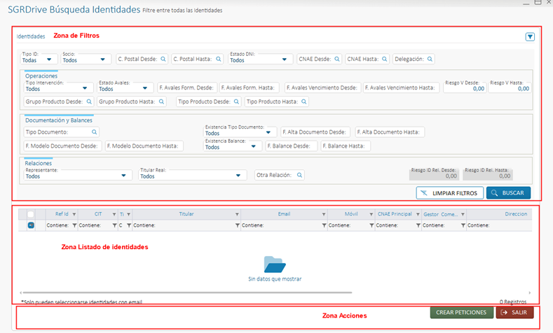 - Zona de Acciones, donde se podrá Crear las Peticiones a los registros seleccionados en el listado, solo se pueden seleccionar identidad con email definido.