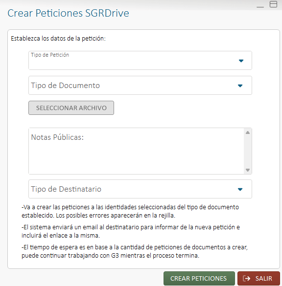 - Seleccionar archivo, estará activo cuando el tipo de petición sea entrega de documentos, petición de documento con plantilla y petición de documento firmado con plantilla.