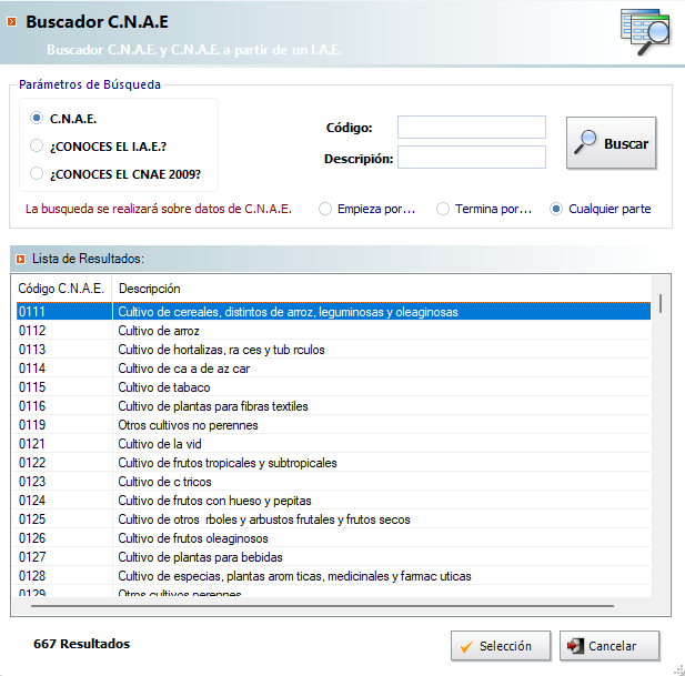 Podemos realizar una búsqueda a través de un IAE. al pulsar sobre esta opción nos mostrará la siguiente pantalla para localizar el IAE deseado y una vez seleccionado nos realizará la trasformación al CNAE correspondiente.