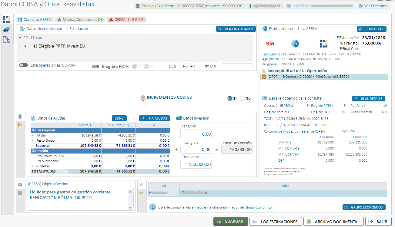 - Zona de etiquetas: se dará información del tipo de Ayuda de la operación RGEC (R), Minimis(M), Marco Temporal Ucrania (U) o Marco Temporal (T), si es PRTR, Situación de la cobertura: Cobertura definitiva o aceptado en Cersa, Diferente indice referencial, Grupo económicos, etc..