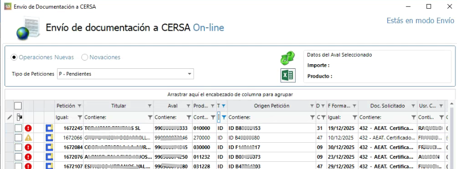 - Pendientes. Peticiones de Documentación realizadas por CERSA y no enviadas por la SGR.