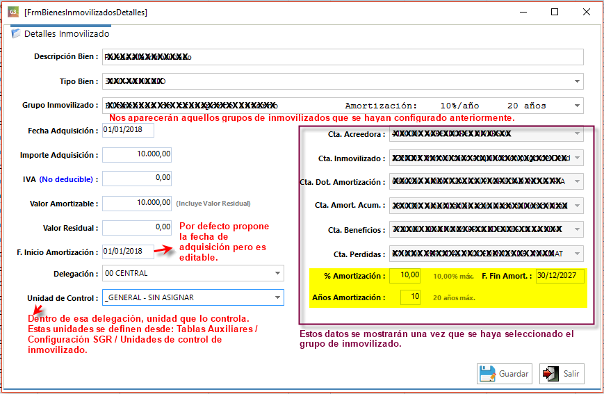 Una vez que seleccionamos el grupo de inmovilizado al que pertenecerá el bien que estamos dando de alta, se mostarán las distintas cuentas que le pertenecen y los datos de amortización. Las cuentas no son editables, para modificar alguna de ellas se deberá hacer desde Tablas Auxiliares/Configuración SGR/Grupo de bienes inmovilizados.