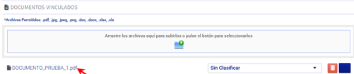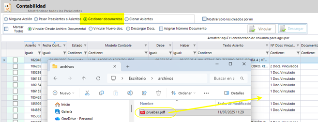 Cuando se tiene marcado “Gestionar Documentos” se podrá vincular los documentos simplemente arrastrando el documento al registro donde se quiera añadir.