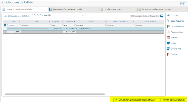 En la pantalla de Lista de Liquidaciones de Fallido se han añadido dos opciones que actúan sobre la fila seleccionada.