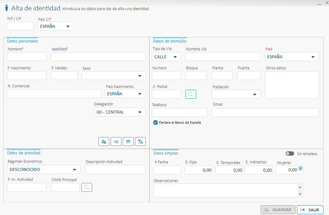 Cuando se intente dar de alta una identidad que ya exista en g3 la pantalla se abrirá en modo edición, permitiendo rellenar el resto de datos que faltan.