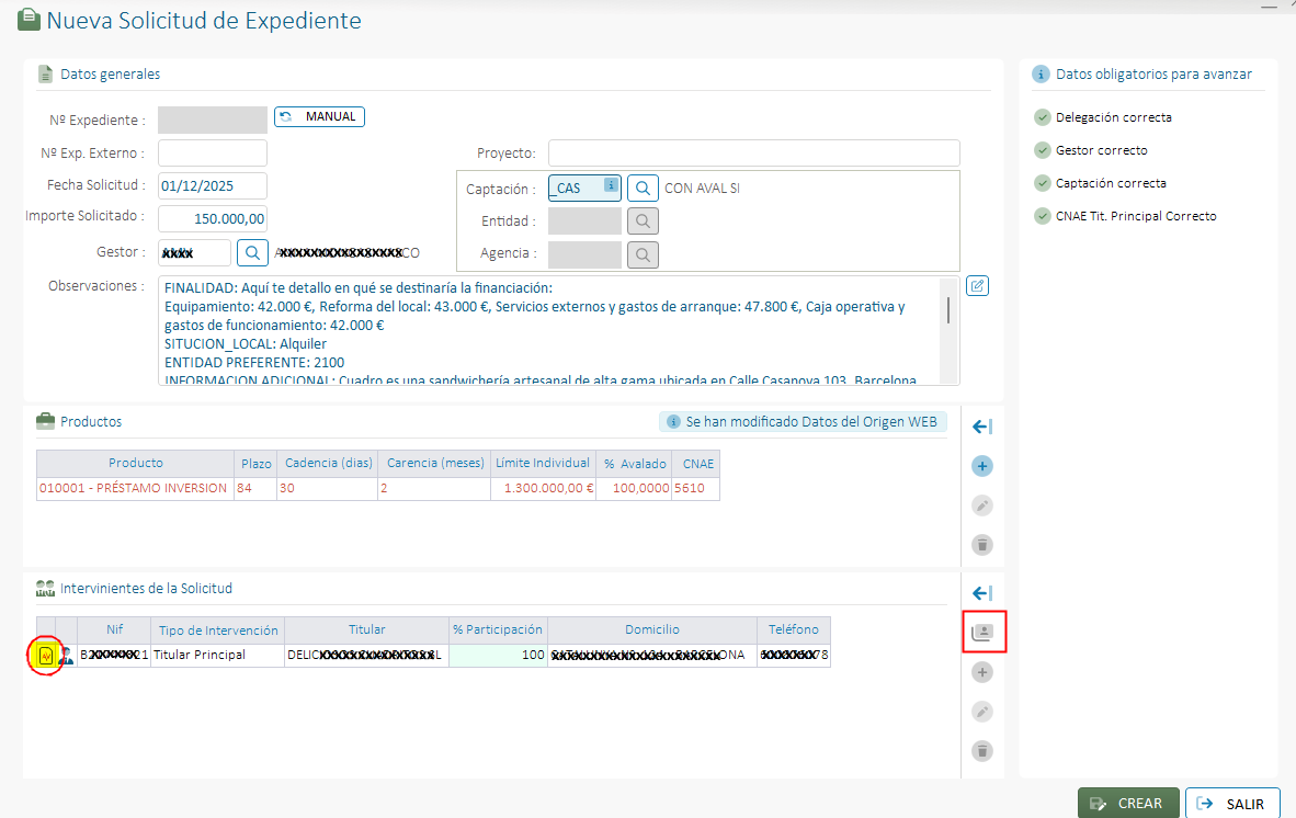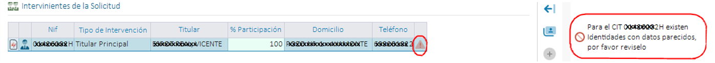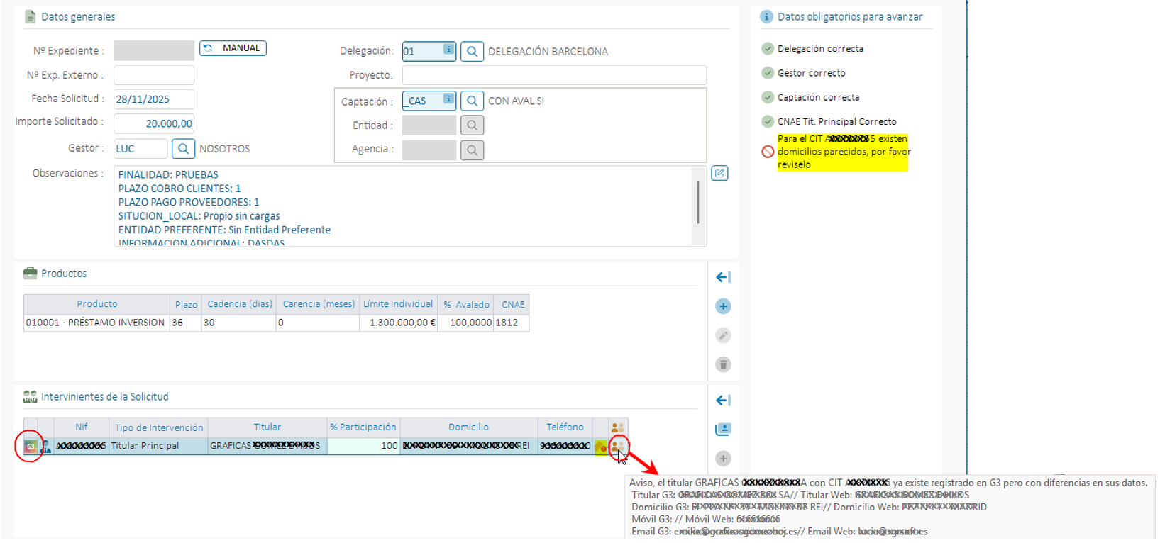1. Sin coincidencias. En los intervinientes de la solicitud, aparecerá el icono de ConAvalSí porque no ha encontrado ninguna identidad coincidente en G3, al no encontrar coincidencias no podremos acceder a ver las coincidencias y al crear el expediente se daría de alta una nueva identidad en G3.