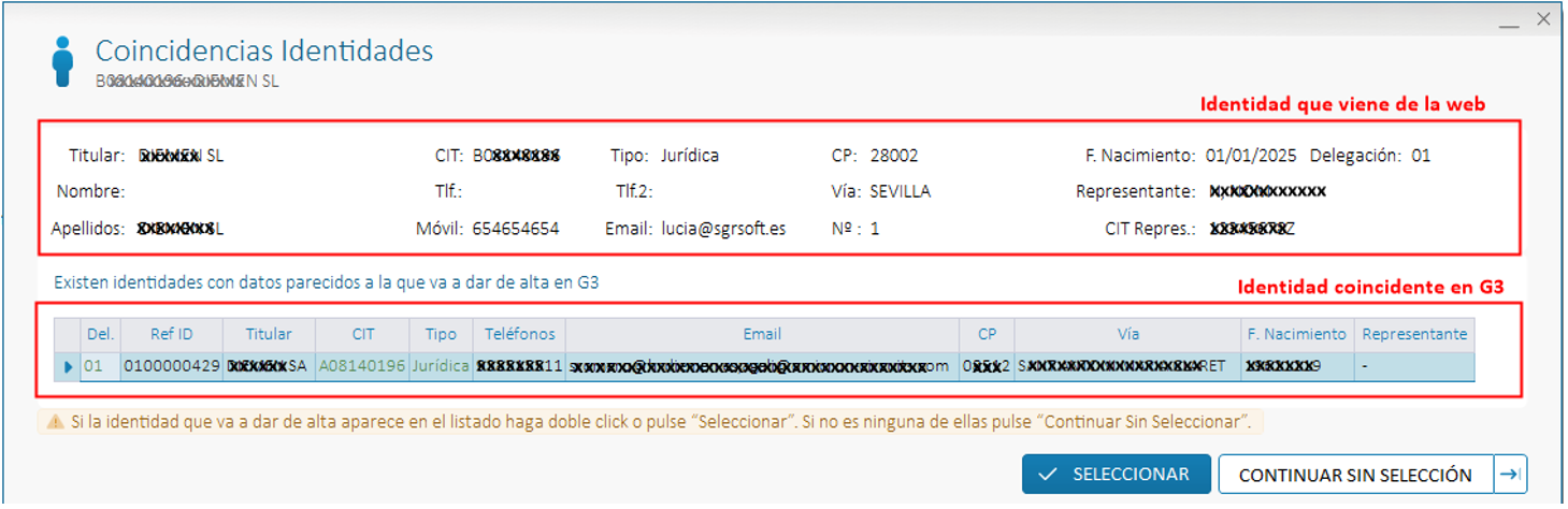 En ambos casos, al revisar las coincidencias el usuario verá los datos de la web y los de la identidad coincidente en G3. Este decidirá si selecciona el de G3 si se trata de la misma persona o crea una nueva identidad (continuar sin selección).