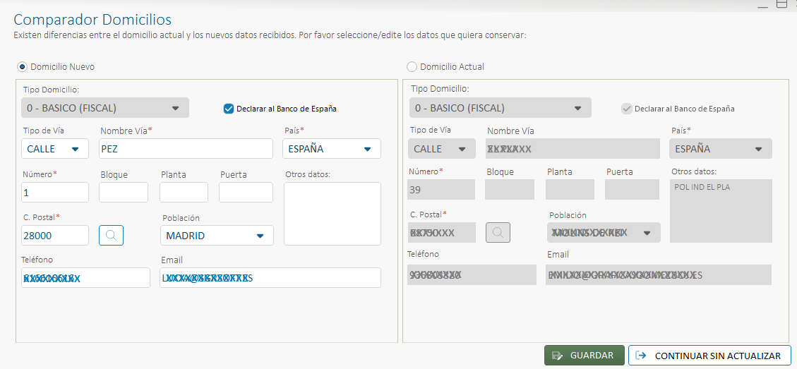 y pasaremos por la pantalla de comparador de domicilio para decidir si quedarnos con el existente en G3 o actualizarlo con los datos que vienen de la web.