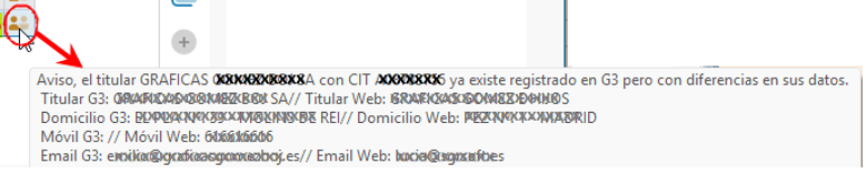 2. Distinto CIT pero coincidencias en el resto de datos. Se mostrará la identidad de la web y el sistema avisará para que el usuario de G3 decida si comparar los datos o no, antes de crear el expediente.