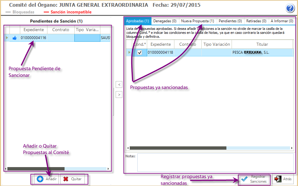 - Arrastrando la propuesta a la pestaña donde se vaya a sancionar (drag&drog), y al revés si se quiere quitar.