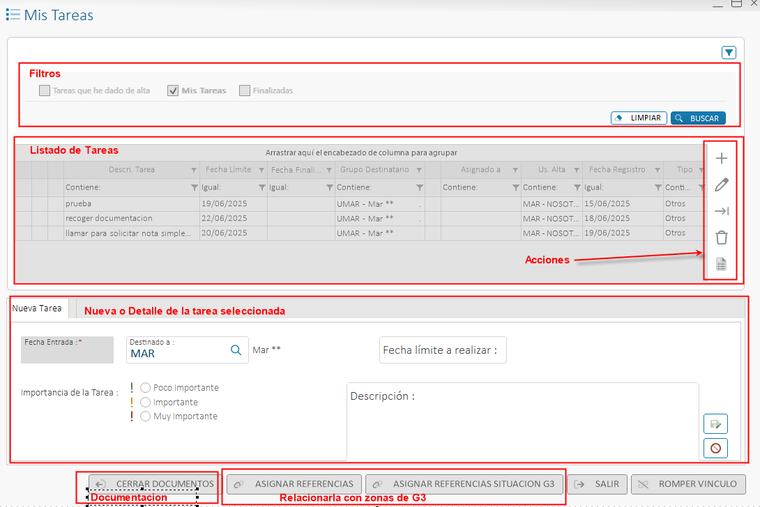 Las tareas pueden ir asociadas a una zona en concreto de G3, desde los botones: